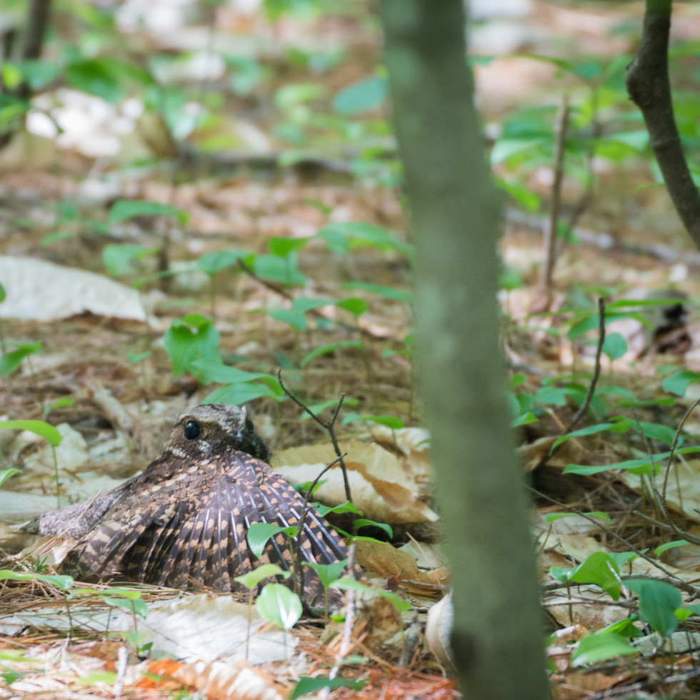 The significance of this encirclement has everything to do with Eastern Whip-poor-will breeding behavior. Whip-poor-wills are nightjars - a group of secretive and well-camouflaged birds that are active primarily at night. The nest on the forest floor, depending upon their superbly cryptic plumage to hide them from predators. Male whip-poor-wills sing at dusk, dawn, and all throughout moonlit nights to define their nesting territories. They patrol the territory boundaries and sing from the ground, tree limbs, stumps, and sometimes houses and other man-made structures. While I have heard whip-poor-wills singing and changing posts many times before, this was the first time I had found myself within a breeding territory. An hour into my observation, something even more interesting happened. While the first whip-poor-will sang from a more distant perch, another bird called from the woods just a few feet across the road. This bird was not singing the onomatopoeic song, however. It was giving a short “quirt” call. These rarely heard whip-poor-will calls are typically used by pair members to stay in contact with one another during the breeding season. At this, the distant singing came to an abrupt halt. Using my headlamp, I watched as the male flew in from its singing post and descended out of sight near the source of the calling and right near the place it had originally started singing. I had potentially found a breeding pair of whip-poor-wills. This was a rare event and one that is becoming increasingly rarer as whip-poor-wills suffer declines throughout eastern North America.